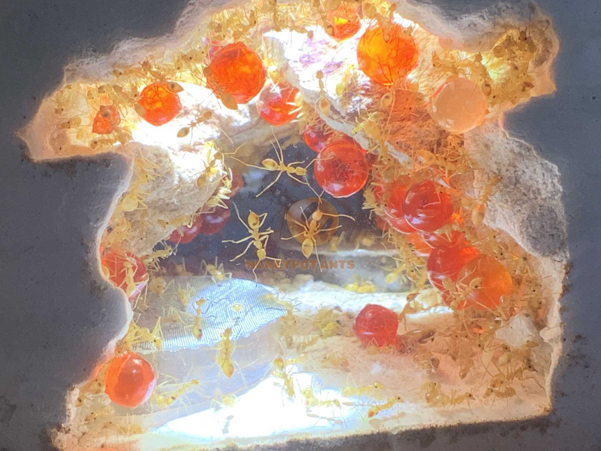 - Những con kiến này có kích thước lớn, màu vàng tươi, và có một tốc độ tăng trưởng nhanh và quy mô đàn lớn. Các tổ mật của chúng có thể cực kỳ lớn, bụng chứa của các Replete chứa nhiều mật. Và là loài cộng sinh với ong bắp cày.